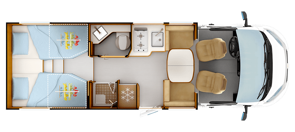 The only compact low-profile motorhome with twin beds, face-to-face bench seats and separate shower