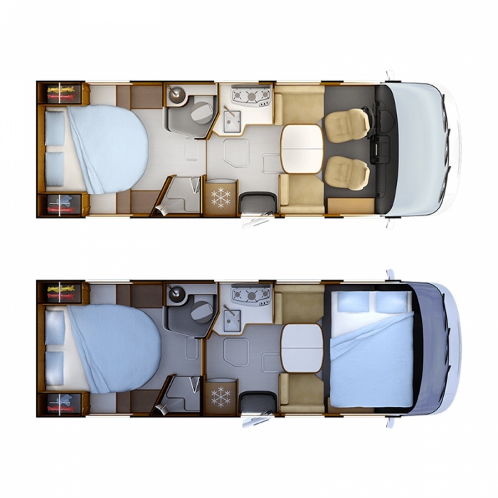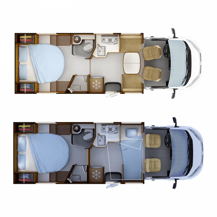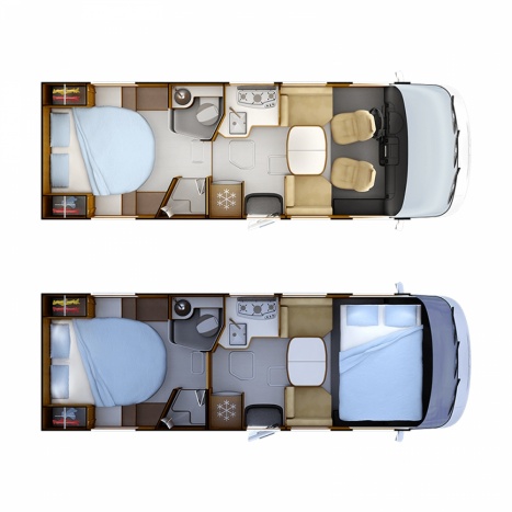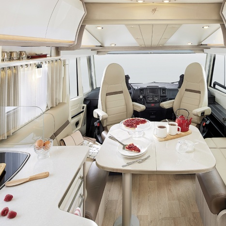 Following the success of the 96 layouts (XXL 160cm-wide central bed and face-to-face living room bench seats), RAPIDO decided to apply it to compact models, and thus the 86 layout was born! It has much in common with the 96 layout: large open living room with face-to-face bench seats and extra wide rear bed (150cm). Three models in separate series are christening this new layout: