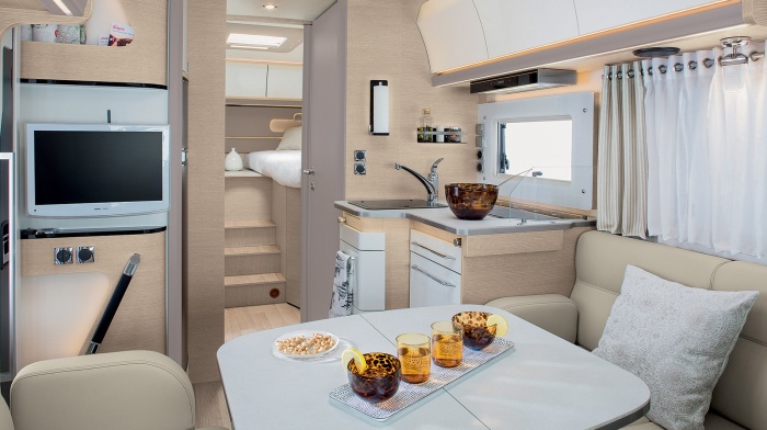 The bathroom benefits from a double separation to ensure privacy for everyone. In the bedroom, there is the choice of an island bed (M96) or two twin beds (M66). The XXL island bed is 160 cm wide to provide home-like comfort. It rests on a retractable base frame so as to facilitate movement at the foot of the bed and raise the headboard for greater comfort.