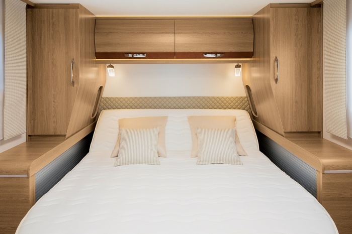 In the bedroom, the retractable bed base can now be found in all our central bed layouts (696F, 896F, 8096dF, i96, i190 and M96). This frees up room at the foot of the bed and makes it easier to move around the motorhome. When parked, you can raise the headboard to enjoy greater comfort.