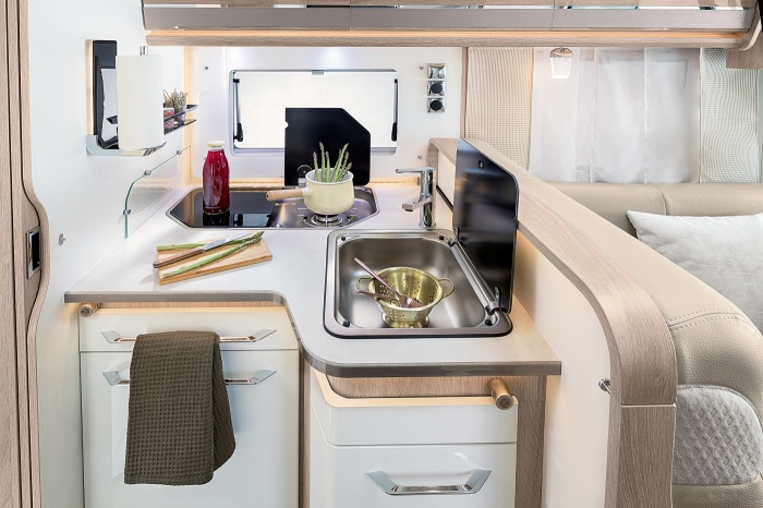The RAPIDO motorhome kitchen, unveiled in the 2019 Collection, offers more new features, starting with a new matte mineral worktop to match the new laminate finish on the living room table. The stove has also been improved and now features two hobs as standard, with the option of three, to suit everyone’s tastes. Sitting alongside this stove in the kitchen is a new stainless-steel sink with a smooth finish.