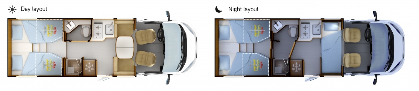 The only compact low-profile motorhome with twin beds, face-to-face bench seats and separate shower